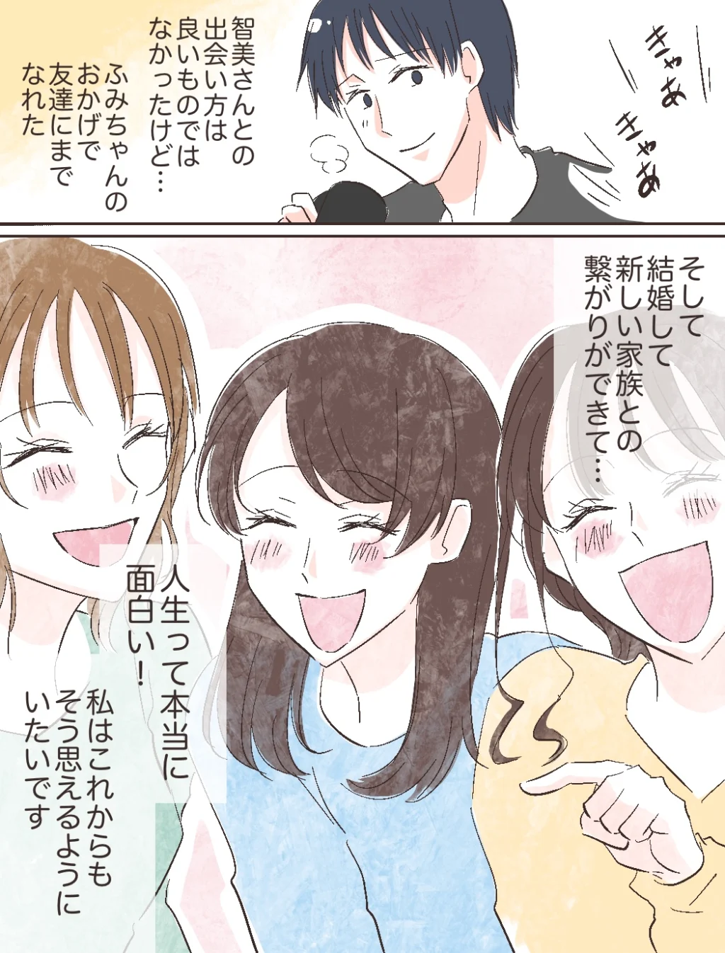 女子3人で盛り上がる私たちを見て、修吾は嬉しそうに微笑んでいました。智美さんとの出会い方は良いものではなかったけど・・、ふみちゃんのおかげで友達にまでなれた。そして、結婚して新しい家族との繋がりができて・・人生って本当に面白い!私はこれからもそう思えるようにいたいです。