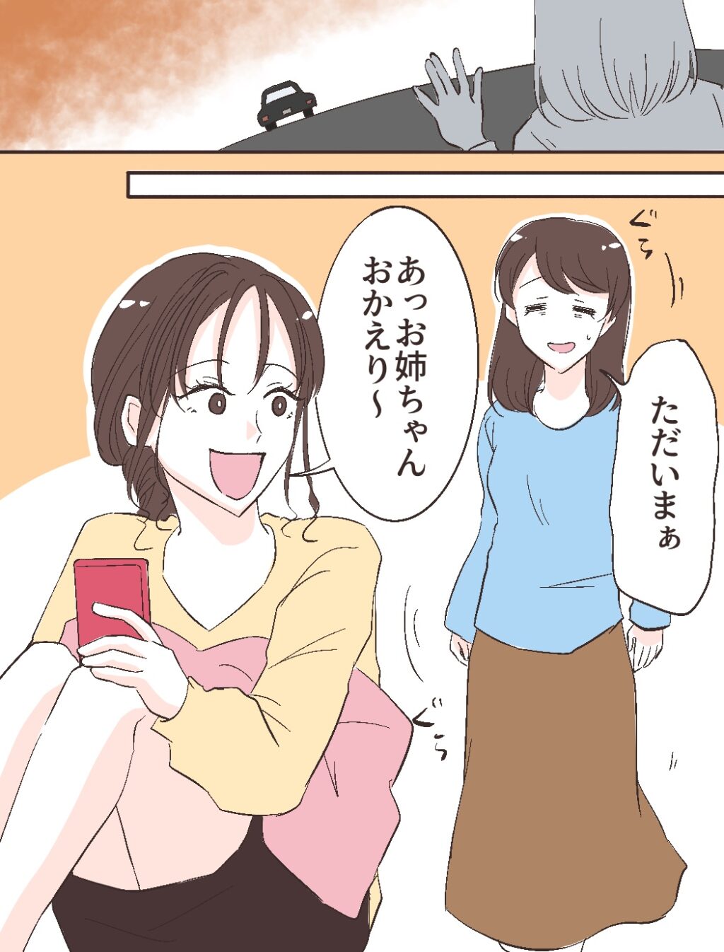 修吾に自宅へ送り届けてもらった私は、気疲れもありくたくた。「ただいまぁ」とぐったりして部屋に入ると、妹のふみのが「あっお姉ちゃんおかえり~」と出迎えてくれました。