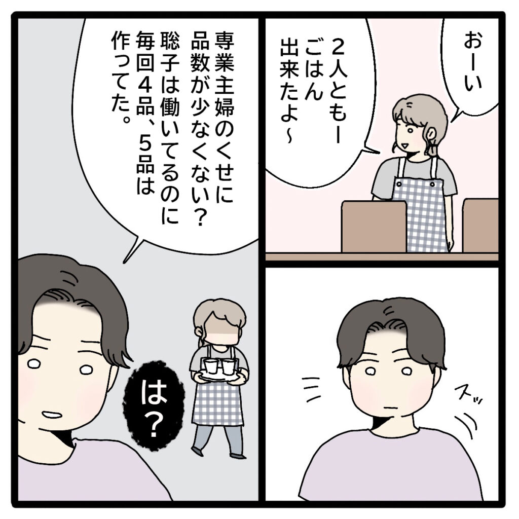 「おーい。2人ともごはんできたよ~」声をかけると正志がスッとやって来てテーブルを確認。そして「専業主婦のくせに品数が少なくない?聡子は働いてるのに毎回4、5品作ってた」と言い出して「は?」と心の中で呟く私。