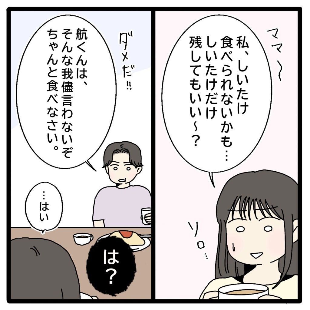 さらに、「ママ~、私、しいたけ食べられないかも・・。しいたけだけ残してもいい~?」リマがそう言うと、「ダメだ!!航くんは、そんなワガママ言わないぞ。ちゃんと食べなさい」と言い出し、リマは「・・はい」と大人しく返事をしたものの、私はまた「は?」とこみ上げる怒りを抑えながら食事していると、