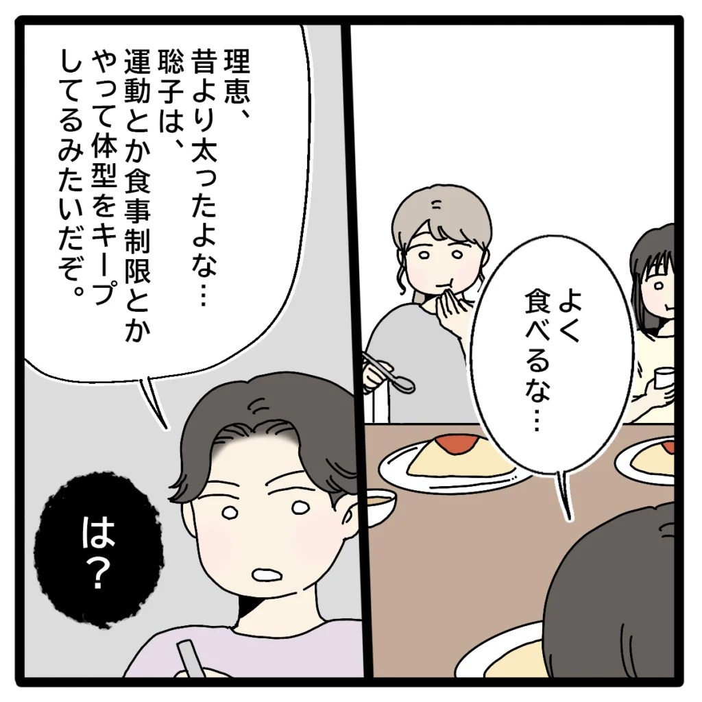「よく食べるな・・」と正志がポツリ。「理恵、昔より太ったよな・・。聡子は、運動とか食事制限とかやって、体型をキープしてるみたいだぞ」平然と言う正志に再び「は?」とこみ上げる怒りを感じていました。