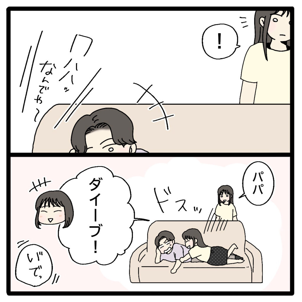 その後、ソファに寝転んでテレビを見ている正志に気づき、「パパ、ダ~イブ!」そう言って正志に飛び掛かるリマ。