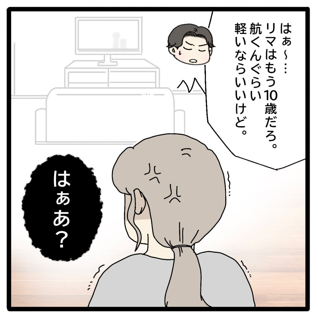 すると、「はぁ~・・リマはもう10歳だろ。航くんぐらい軽いならいいけど」聡子さんだけでなく航くんまで引き合いに出す態度に、「はぁあ?」と開いた口が塞がりませんでした。