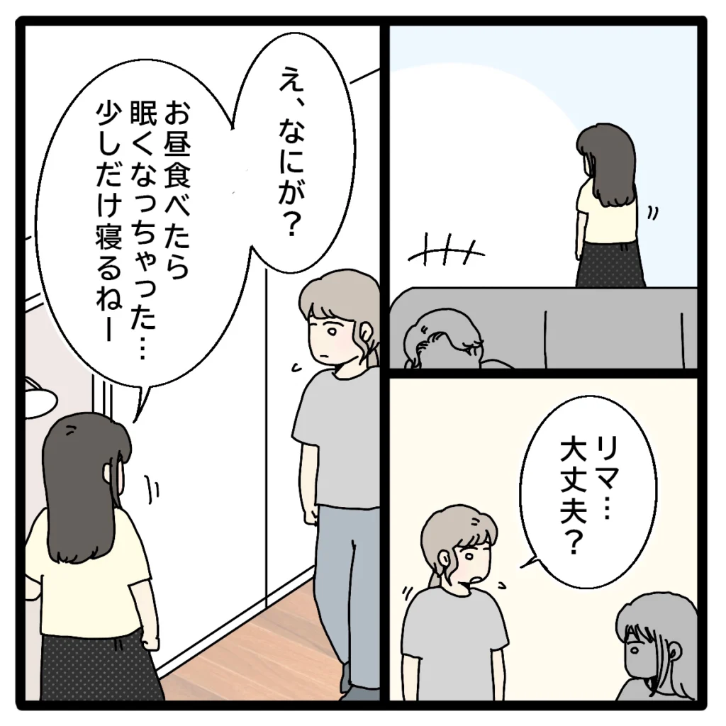 その後、「リマ・・大丈夫?」とたずねると、「え、なにが?お昼食べたら眠くなっちゃった・・少しだけ寝るねー」そう言ってリビングを出て行くリマちゃん。