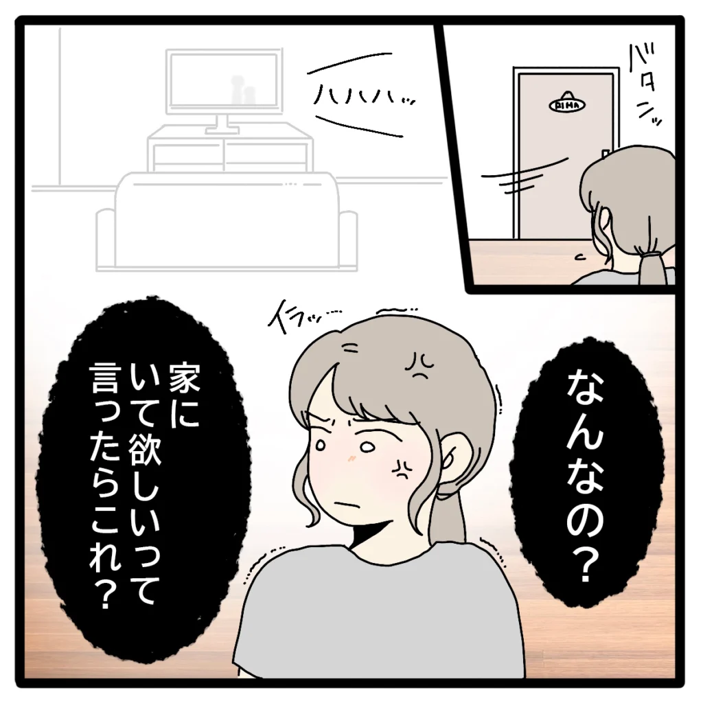 リマちゃんがリビングを出た後、ソファに寝転びながらテレビを見て笑っている正志を見て、「なんなの?家にいて欲しいって言ったらこれ?」とイライラがおさまりませんでした。