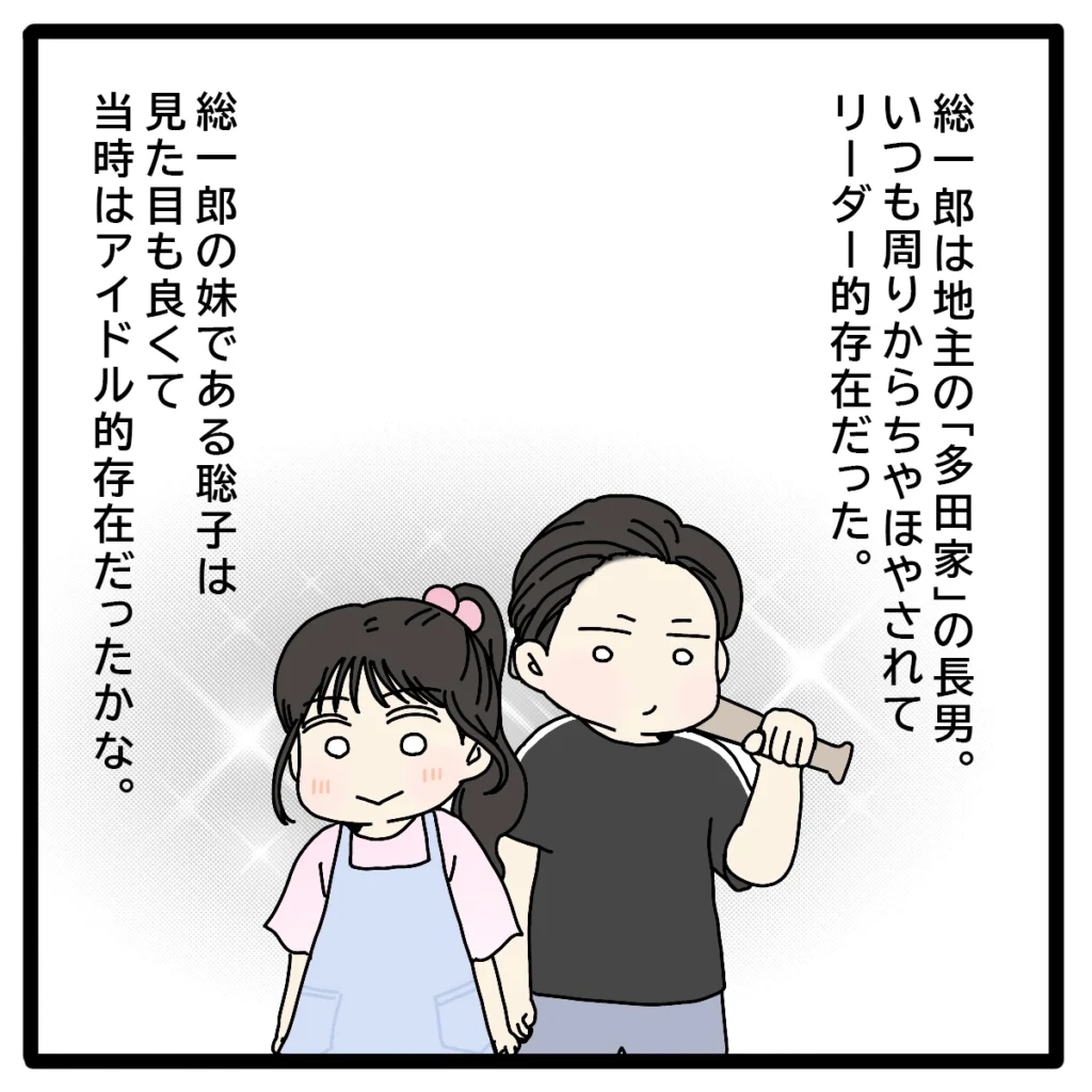 総一郎さんと聡子さんきょうだいは地主である多田家の子どもたち。長男総一郎さんはいつも周りからちやほやされてリーダー的存在でした。そして聡子さんはルックスの良さでも有名で、子どもの頃からみんなのアイドル的な存在だったそうです。