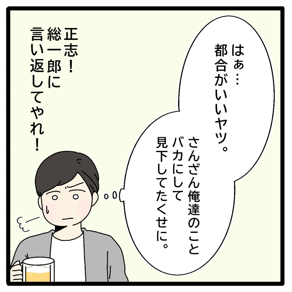 総一郎さんが地主の長男で、同級生たちのリーダー的存在だったのに対して、正志と裕二さんはクラスの端っこにいるような目立たないタイプ。学生時代は正志たちのことを散々見下していたのに、有名企業に就職したと分かった途端、総一郎さんは正志のことを「聡子の結婚相手にふさわしいのは正志だった」と都合よく持ち上げました。