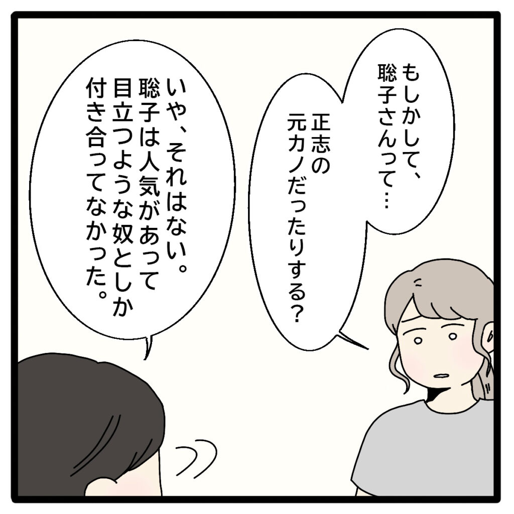 裕二さんの話をひと通り聞き終えた私は「もしかして、聡子さんって・・・正志の元カノだったりする?」と尋ねました。もし昔付き合っていたのなら、あの執着ぶりにも納得がいきます。しかし裕二さんは、「いや、それはない」ときっぱり否定。聡子さんは容姿も良く、当時から人気者だったため、学生時代も目立つタイプの人としか付き合っていなかったそうです。