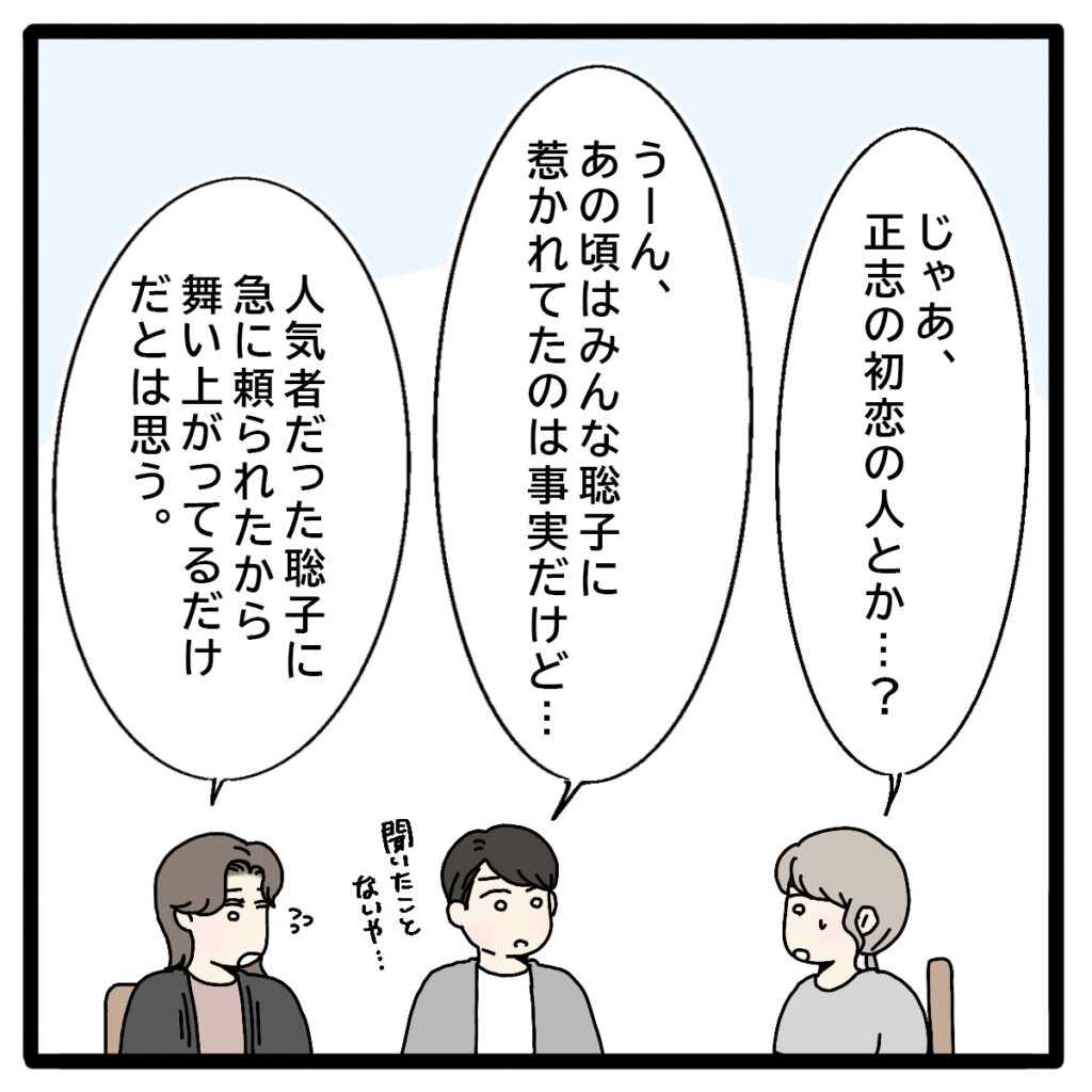 「じゃあ、正志の初恋の人とか・・・?」私がそう尋ねると、「うーん、あの頃はみんな聡子に惹かれてたのは事実だけど」と特に思い当たる節はない様子。美沙ちゃんは「人気者だった聡子に急に頼られたから、舞い上がってるだけだとは思う」と言いました。