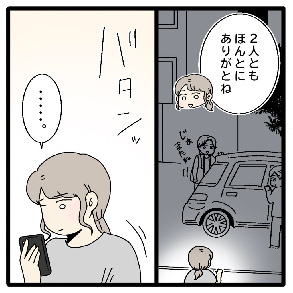 「2人とも、ほんとにありがとね」自分のために2時間もかけて来てくれた裕二さんと美沙ちゃんに改めて感謝を伝え、私は2人を見送りました。そして家の中に戻ってくると、正志とこれからのことを話し合うために、スマホを手に取りました。