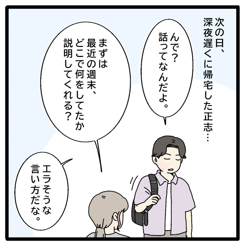 結局、正志が帰ってきたのは翌日の深夜遅くでした。「んで?話ってなんだよ」帰ってくるなり面倒くさそうにする正志に、私は「まずは最近の週末、どこで何をしてたか説明してくれる?」と問いかけます。正志は私を横目でにらむと「エラそうな言い方だな」と悪態をつきました。