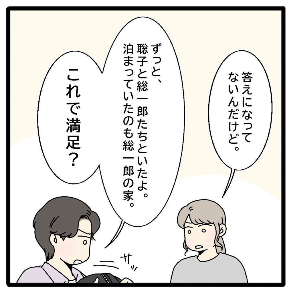 「答えになってないんだけど」私がそう返すと、正志は「ずっと聡子と総一郎たちといたよ、泊まっていたのも総一郎の家、これで満足?」と吐き捨てるように言いました。やっぱり、実家に泊まっていたという話は嘘で、本当は総一郎さんの家に泊まっていたのです。