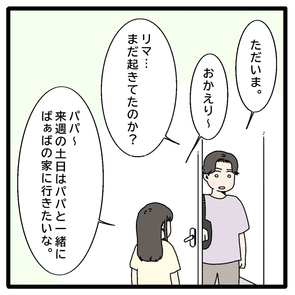 「ただいま」いつも通り、夜遅くに帰宅した正志。するとリマが珍しく「おかえりー」とパジャマ姿で出迎えます。「リマ・・・まだ起きてたのか?」正志がそう声をかけると、リマが突然「パパー、来週の土日はパパと一緒にばぁばの家に行きたいな」と言い出しました。