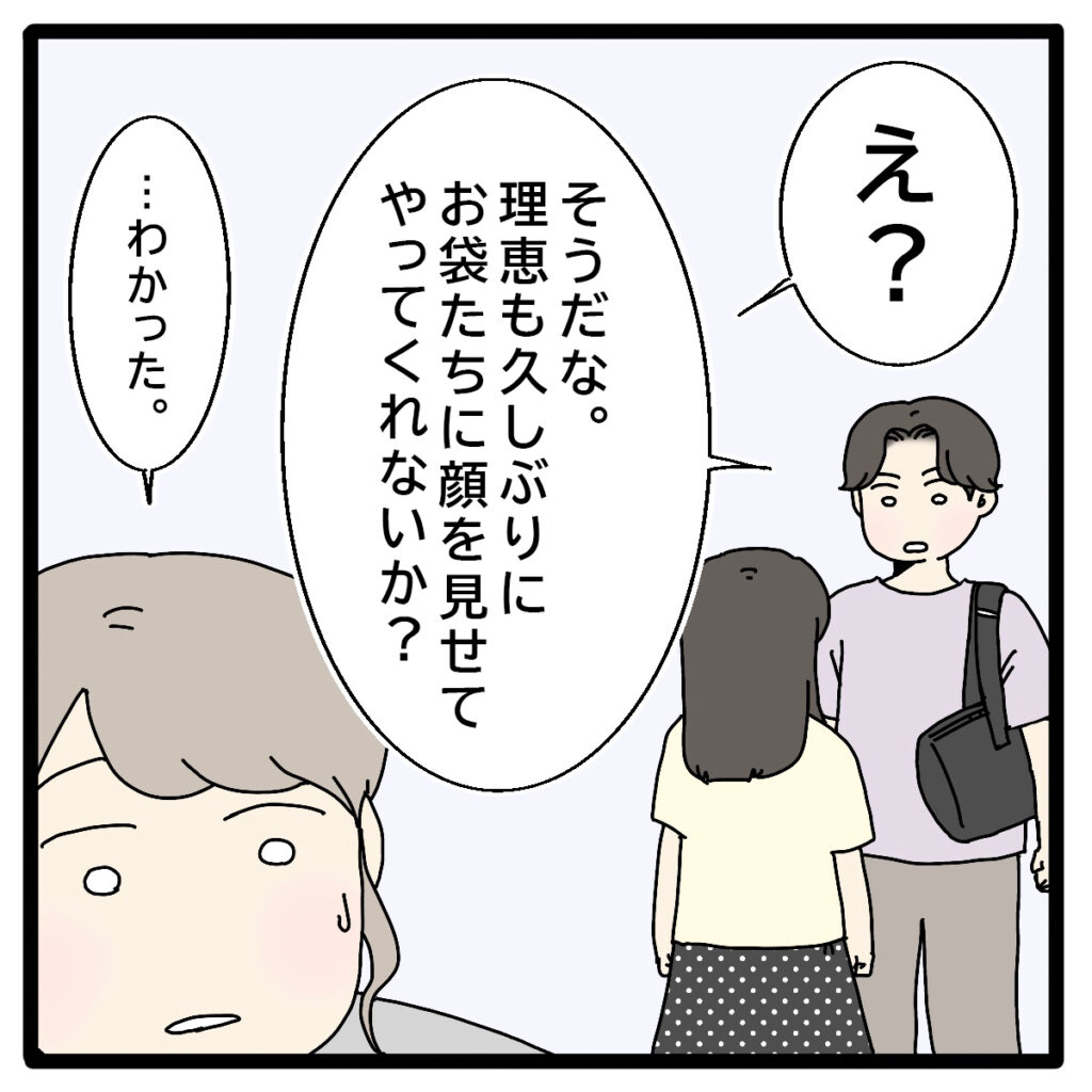 会話もなく、一緒に出かけることすらない。今の正志さんは、戸籍上つながっているだけの存在です。この冷え切った夫婦関係をリマちゃんに見せ続けるくらいなら、いっそ別れてしまった方がいいのではないかと思ってしまうのも無理はありません。それにしても、なぜ今になって急に理恵さんを義実家へ連れて行くと言い出したのか。正志さんが何を考えているのか、ますます分からなくなりますね。