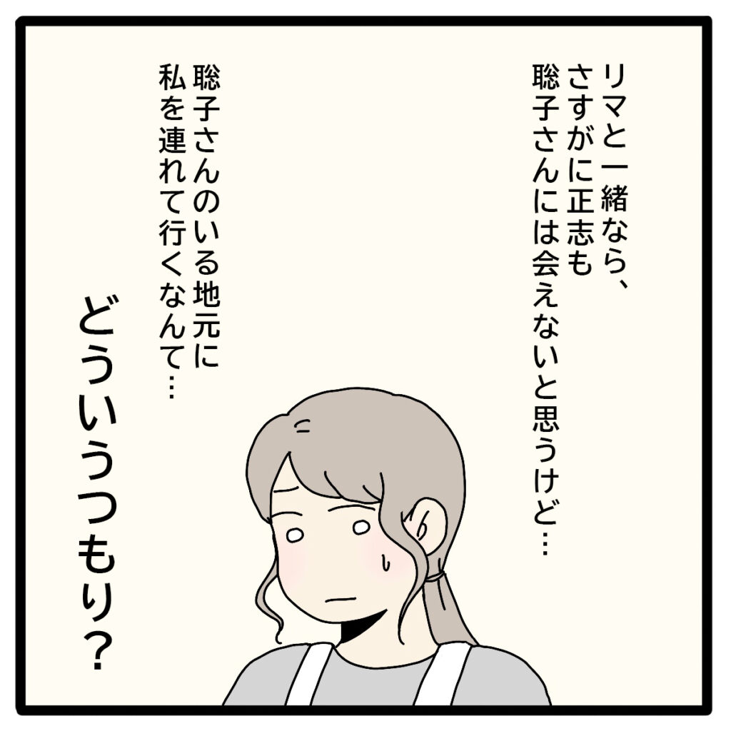 地元に帰って何をしていたのか尋ねると、聡子さんとデートするわけでもなく、ただ聡子さんとその息子の航くん、そして多田家のために動いていたと言う正志。恐る恐る「私やリマより聡子さんの方が大切なの?」と聞くと、正志は「聡子は特別な存在、俺は彼女を支えたい」と曇りのない目で言いました。学生時代に遠くから眺めていただけの相手に、私たちが家族として積み重ねてきた時間が負けるなんて、とても信じられませんでした。