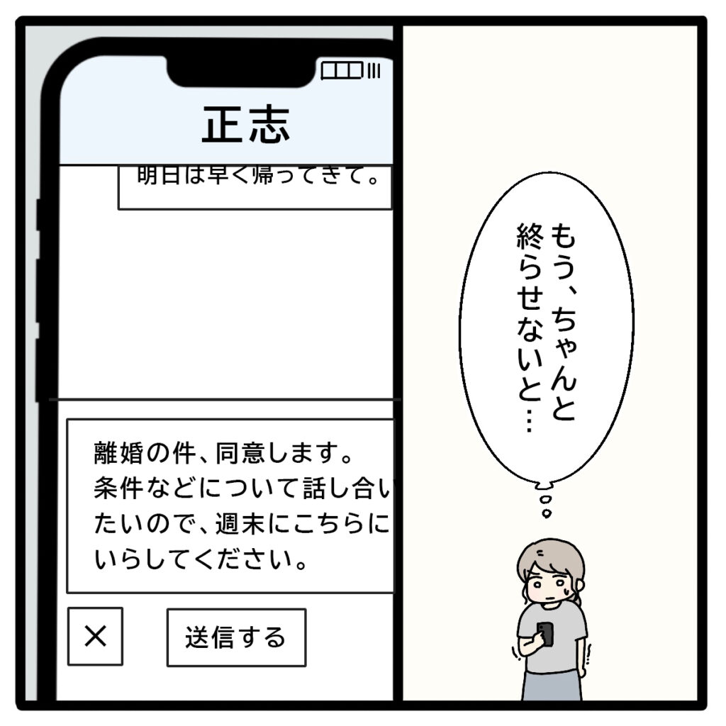 ついに、正志との関係を終わらせる時がきました。決断するまでに時間はかかりましたが、たくさんの人に背中を押されて、もう私の中に迷いはありません。私は正志に「離婚に同意します、条件などについて話し合いたいので、週末にこちらにいらしてください」とメッセージを綴りました。