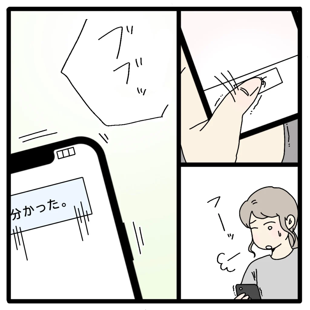 震える手で送信ボタンを押しました。どれだけ心を決めていても、行動に移す瞬間はやっぱり怖さが込み上げてきます。すると息つく暇もなく、正志から「分かった」と返信が。こういうメッセージにだけすぐに返信してくるなんて・・・本当に正志は変わってしまいました。