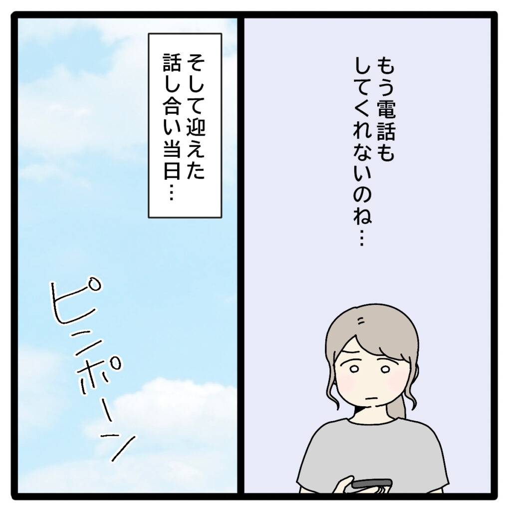離婚に応じると伝えた途端、即座に返ってきたメッセージ。正志さんのあからさまな態度に思わず嫌気がさしますね。しかも、離婚の話し合いだというのに、原因となった聡子さんの姿は最後まで見せずじまい。ここまで不誠実な人だったのかと驚いてしまいます。