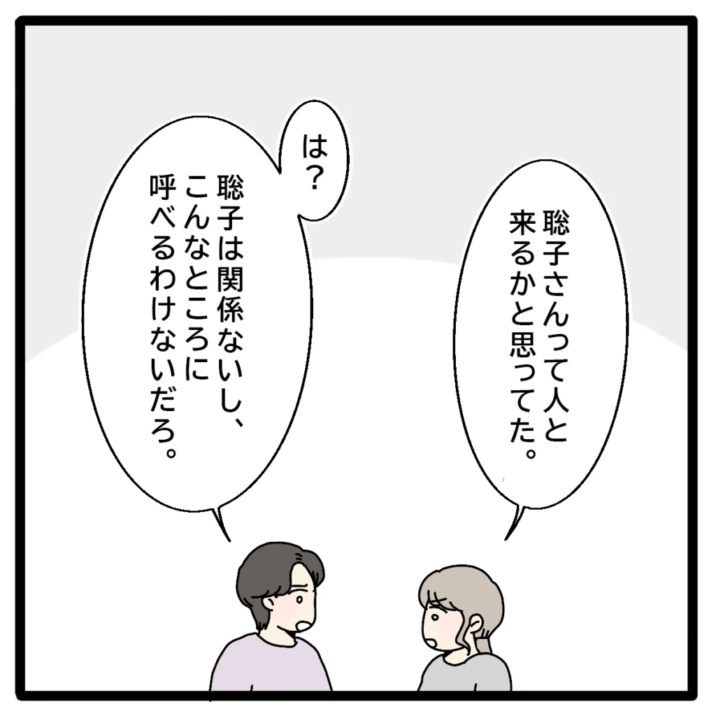 けれど、肝心の聡子さんの姿はありませんでした。離婚の原因となった人物なのだから、顔を出してもおかしくないはずです。私が正志に、「聡子さんって人と来るかと思ってた」と伝えると、彼は眉をひそめて「は?聡子は関係ないし、こんなところに呼べるわけないだろ」と言いました。