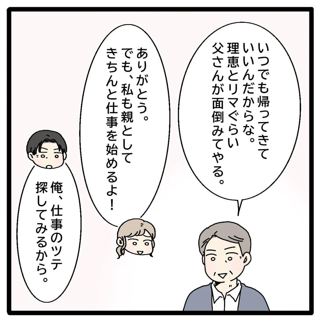 父は「いつでも帰ってきていいんだからな。理恵とリマぐらい父さんが面倒みてやる」と笑顔で言ってくれ「ありがとう。でも、私も親としてきちんと仕事を始めるよ」と言うと、兄も「俺、仕事のツテ探してみるから」と言ってくれました。離婚条件の話し合いのときもお父さんとお兄ちゃんがいてくれて本当に心強かったけれど、こうやって私のために色々と考えてくれるのは本当にありがたいです。