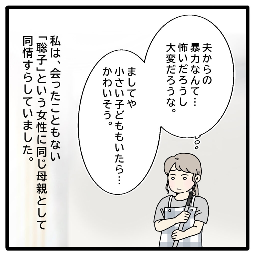 「夫からの暴力なんて怖いだろうな、ましてや小さい子どももいたら・・・かわいそう」私は、会ったこともない聡子さんに同じ女性として、そして同じ母親として同情しました。安全な場所に帰ってこれてよかった。今はとにかくゆっくり休んで欲しいな。