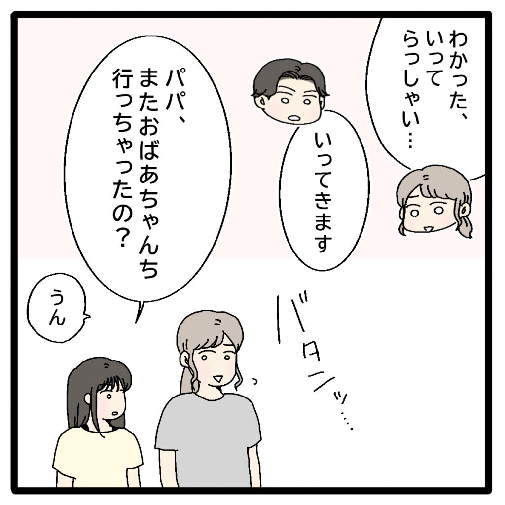 「わかった、いってらっしゃい」幼馴染のためと言われると引き止めることもできず、釈然としない気持ちを胸に抱えたまま、私は正志を送り出します。すると、その様子を見ていたリマが「パパ、またおばあちゃんち行っちゃったの?」と聞いてきました。