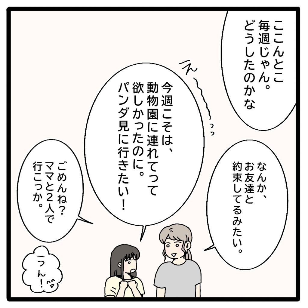 「お友達と約束してるみたい」と伝えると、リマは残念そうに「今週こそは動物園に連れてって欲しかったのに!」と言いました。リマもまだまだパパと遊びたいお年頃。休日を一緒に過ごせないとなると、寂しい思いをするのは当然です。でも、これも聡子さんが落ち着くまでの辛抱。私はリマに「ごめんね、ママと2人で行こっか」とそっと微笑みかけたのでした。
