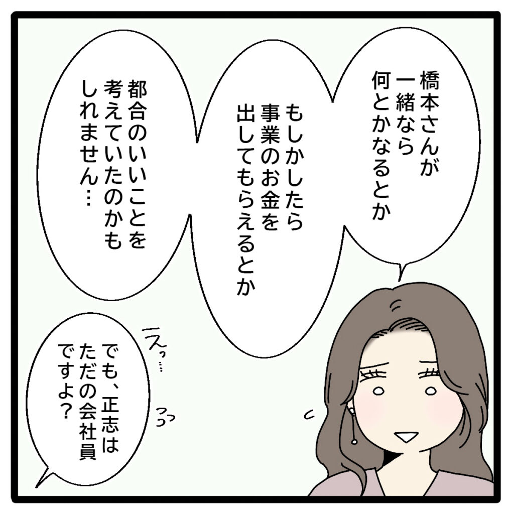 「橋本さんが一緒なら何とかなるとか、もしかしたら事業のお金を出してもらえるとか、都合のいいことを考えていたのかもしれません・・」と言葉を重ね、それを聞いた私は「えっ・・でも、正志はただの会社員ですよ?」そう聞き返すと、