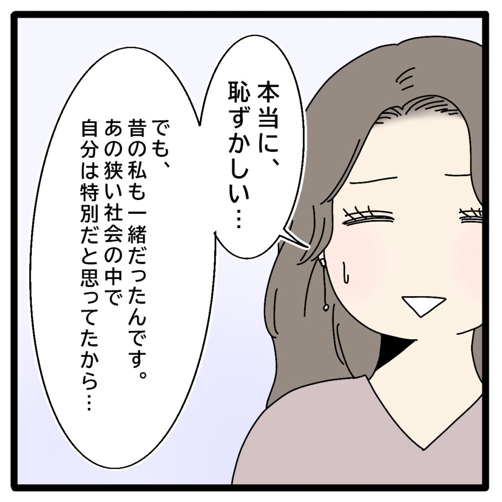 「本当に、恥ずかしい・・でも、昔の私も一緒だったんです。あの狭い社会の中で自分は特別だと思ってたから・・」と自分自身を戒めるように話す聡子さん。