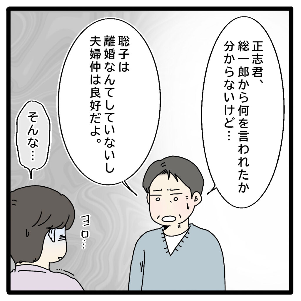 すると、総一郎さんのお父さんが正志を気の毒そうに見つめながら「正志くん、総一郎から何を言われたか分からないけど、聡子は離婚なんてしていないし夫婦仲は良好だよ」と真実を告げます。それを聞いた正志は足をふらつかせ、「そんな・・・」と力なくつぶやきました。