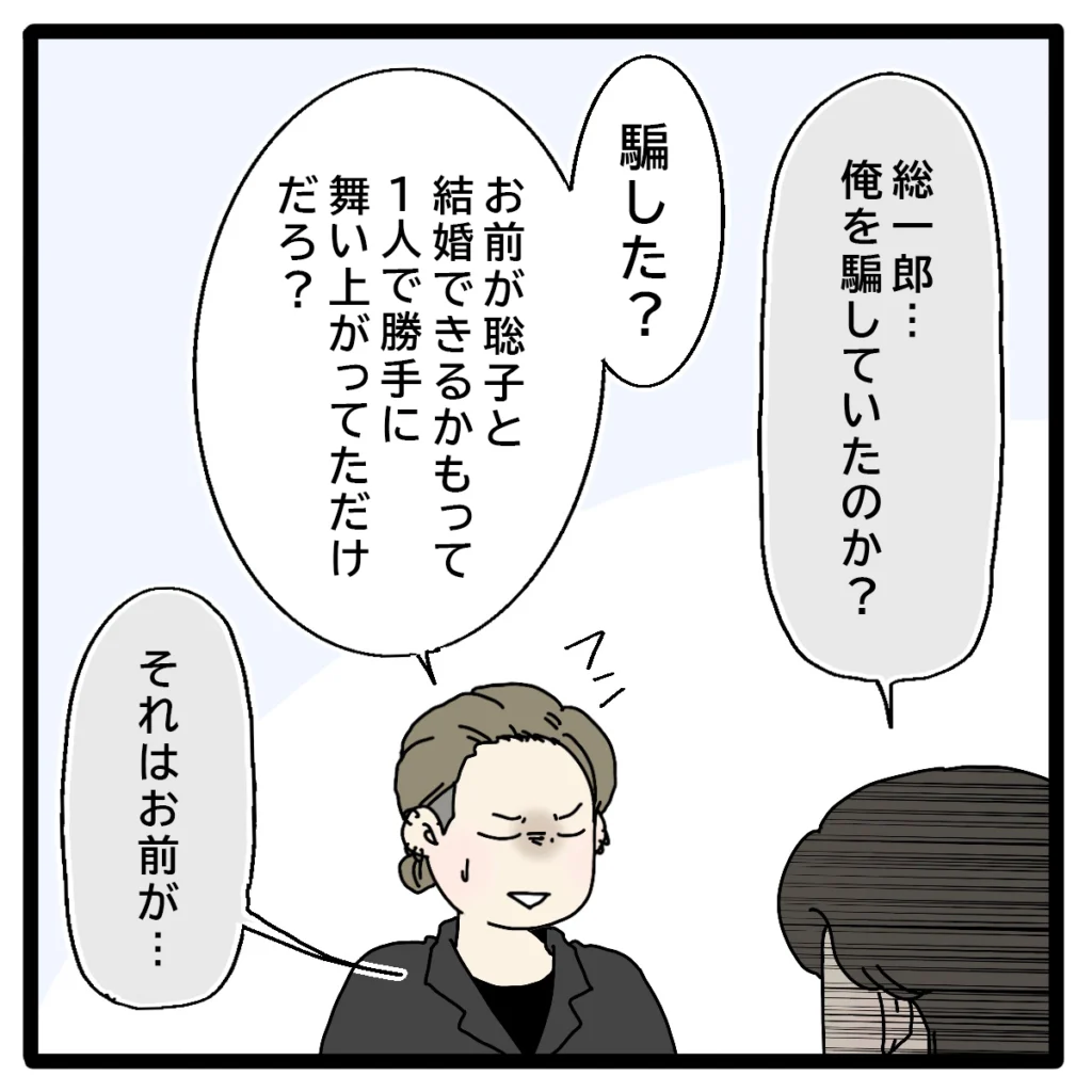 「総一郎どういう事だよ?聡子、離婚したんじゃ・・・」震える声で正志が問い詰めると、総一郎さんは焦った様子で「うるさいな!離婚させる予定だったんだよ!」と声を荒げます。その言葉を聞いた瞬間、正志は言葉を失い、固まってしまいました。