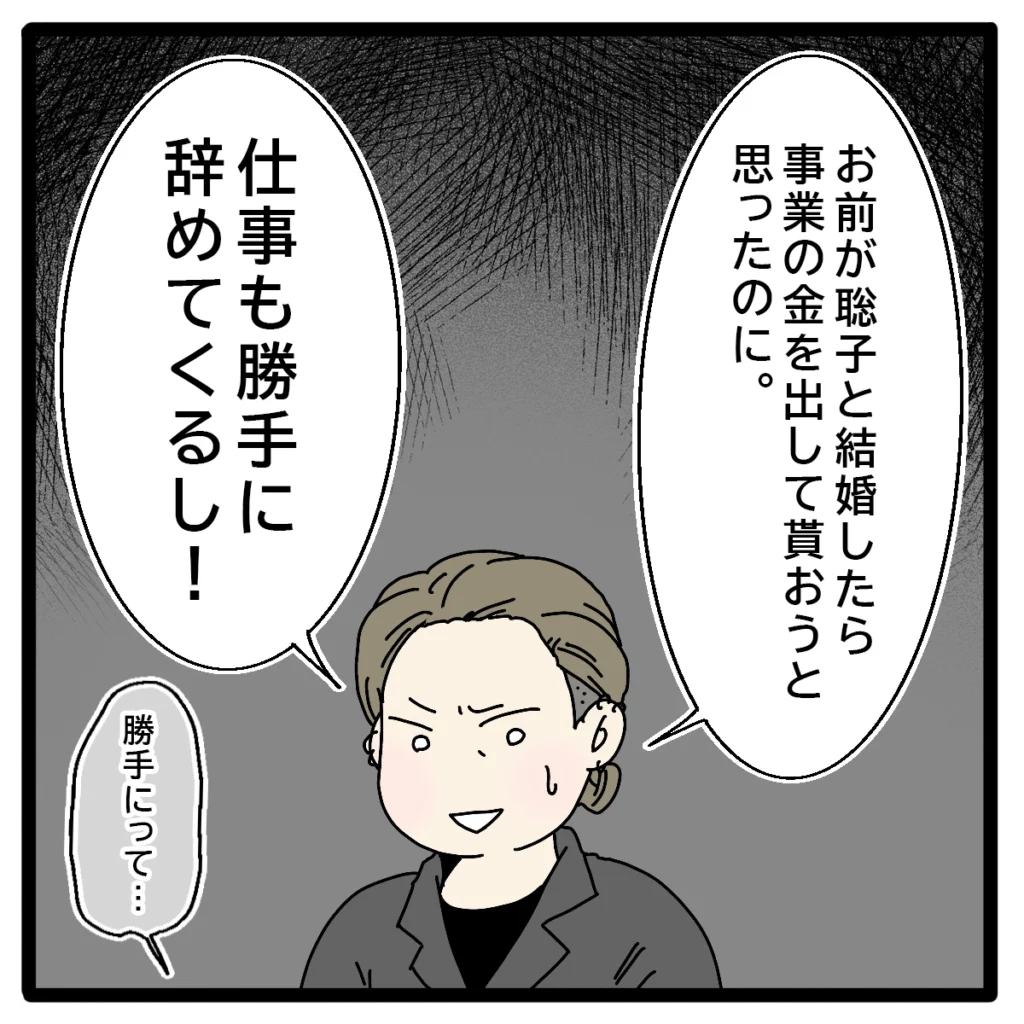 やはり聡子さんの言った通り、総一郎さんの狙いは大手企業に勤めていた正志のお金だけだったようです。その会社を辞めた今、正志はもはや用済みだったのでしょう。「お前が聡子と結婚したら、事業の金を出してもらおうと思ったのに・・・仕事も勝手に辞めてくるし!」そう言って、水面下で進めていた計画をあっさりと明かしました。
