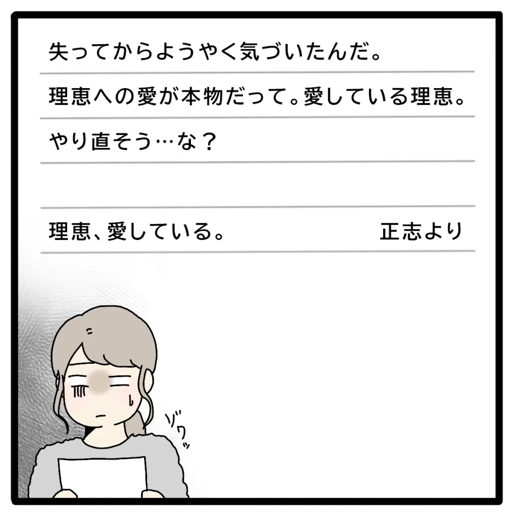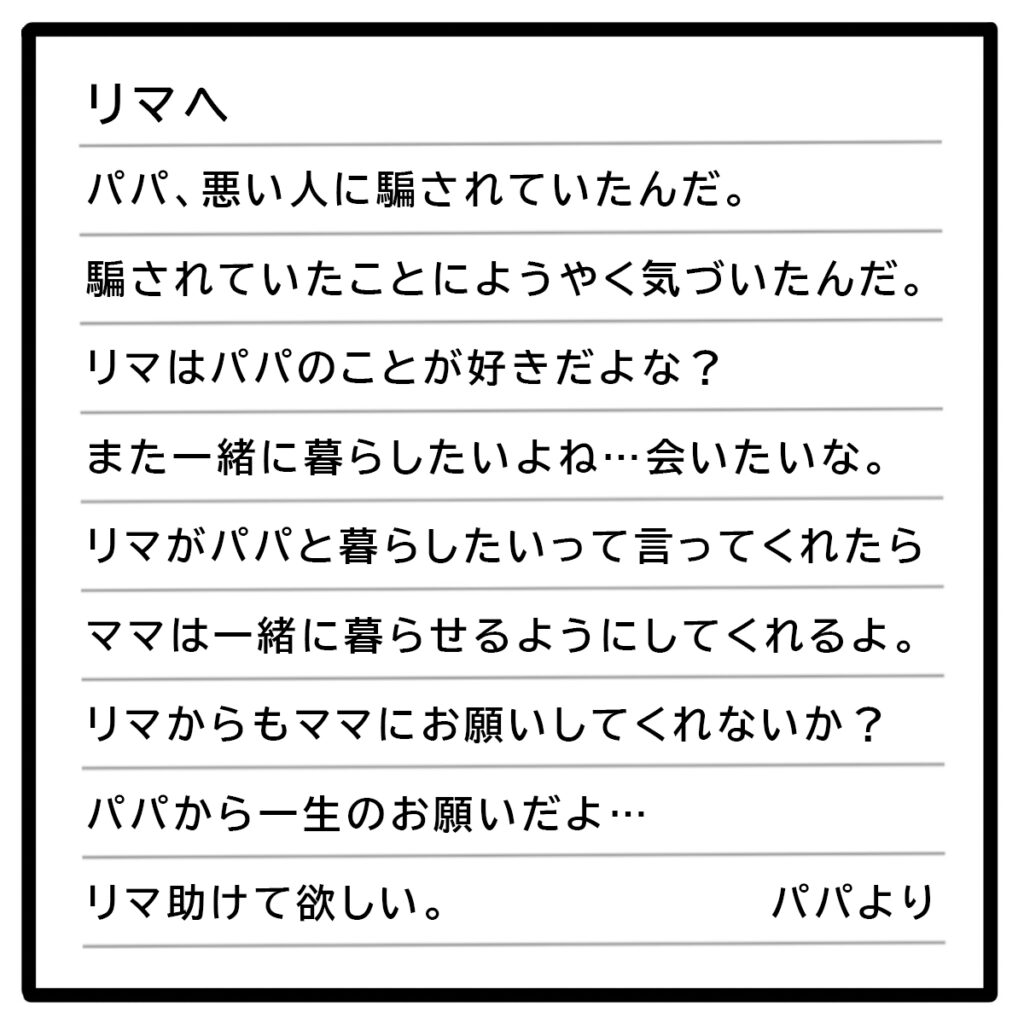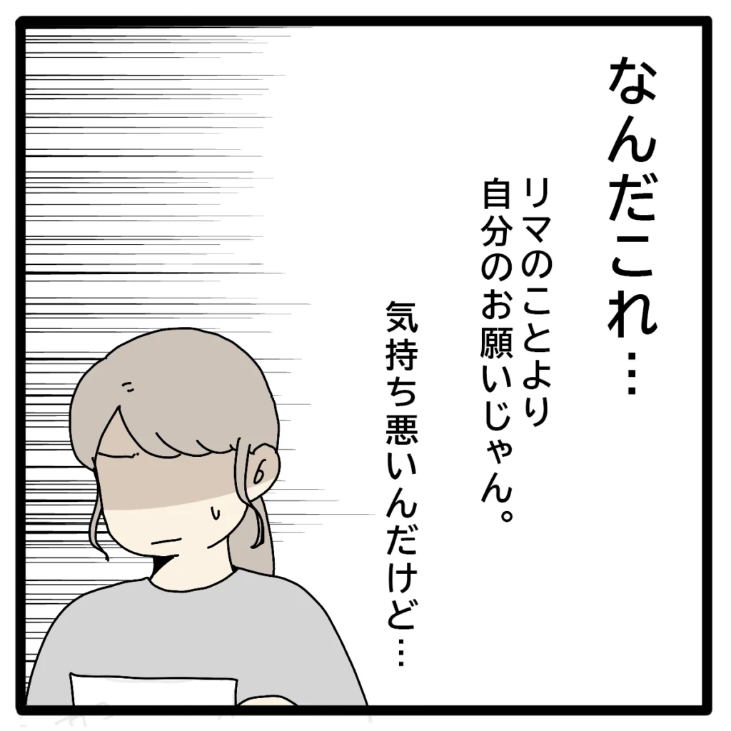 リマへの手紙を読んで、「なんだこれ・・リマのことより自分のお願いじゃん。気持ち悪いんだけど・・」と思った私。もう心の中には正志への愛情はこれっぽっちも残っていないことを痛感したのでした。