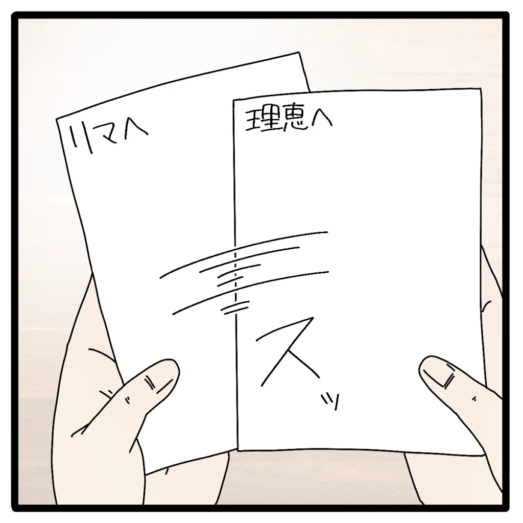 同窓会で地元に帰り、地主の息子総一郎さんの妹で初恋の相手でもある聡子さんが離婚して戻ってきたと知った正志さんは家族よりも彼女を優先するように。理恵さんは浮気を疑い、正志さんは否定するも、聡子さんを支えたいと離婚を切り出され、娘リマちゃんの親権と家、正志さんの退職金と預貯金を養育費として受け取ることを条件に離婚に同意、しばらく経った頃美沙さんから連絡を受け聡子さんと会うことに。聡子さんは、自分のせいで離婚させてしまったことを理恵さんに謝罪した後、学生時代に正志さんからストーカーまがいの行為を受けていたことを告白、そもそも夫とも離婚していないどころかやり直すつもりと聞き理恵さんはビックリ。その後、聡子さんは総一郎さんには夫に会いに行くと嘘をつき、夫の赴任先である海外へ。聡子さんと再婚する話も総一郎さんと事業を立ち上げる話もなくなり、たったひとり放り出された正志さんは、酔った勢いでかつて理恵さんたちと暮らした家に行き泣き喚いて警察沙汰に。心配する美沙さんの予想通り、実家にあらわれた正志さんは2人に会いたいと立ち尽くし、母親から当分こっちに来ない方がいいと言われた理恵さんは、泣きながら書いたという手紙を送ってもらうことにしました。