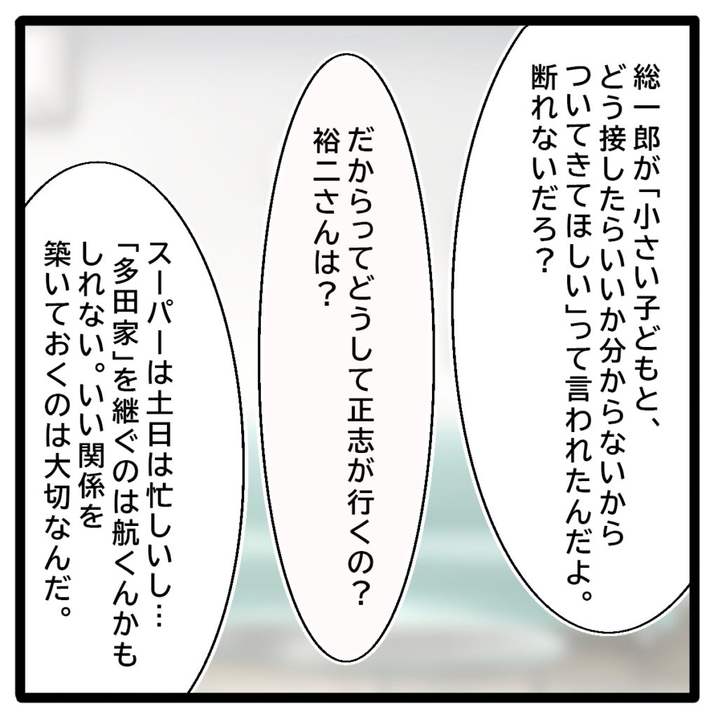 すると、「総一郎が「小さい子どもとどうっ接したらいいか分からないからついてきて欲しいって言われたんだよ。断れないだろ?」しごろもどろで話す正志に、「だからってどうして正志が行くの?裕二さんは?」私が聞き返すと、「スーパーは土日は忙しいし・・。『多田家』を継ぐのは航くんかもしれない。いい関係を築いておくのは大切なんだ」正志の言葉に、