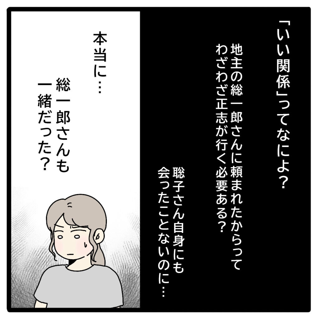 「『いい関係』って何よ?地主の総一郎さんに頼まれたからって、わざわざ正志が行く必要ある?聡子さん自身にも会ったことないのに・・。本当に総一郎さんも一緒だった?」またしてもモヤモヤが募ります。