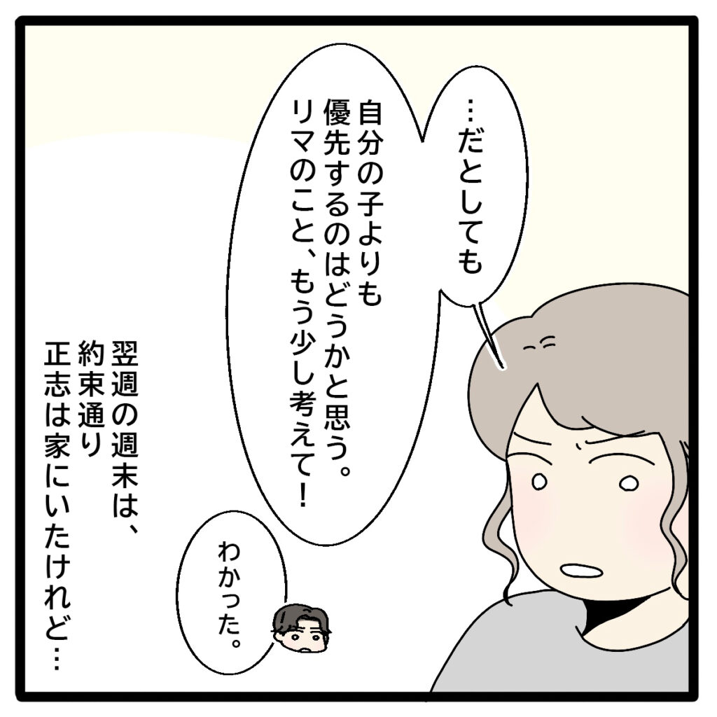 「・・だとしても、自分の子よりも優先するのはどうかと思う。リマのこと、もうすこし考えて!」正志にそう言うと、「わかった」と答え、「翌週の週末は約束通り家にいたものの・・」やっぱりモヤモヤがおさまることはなさそうでした。
