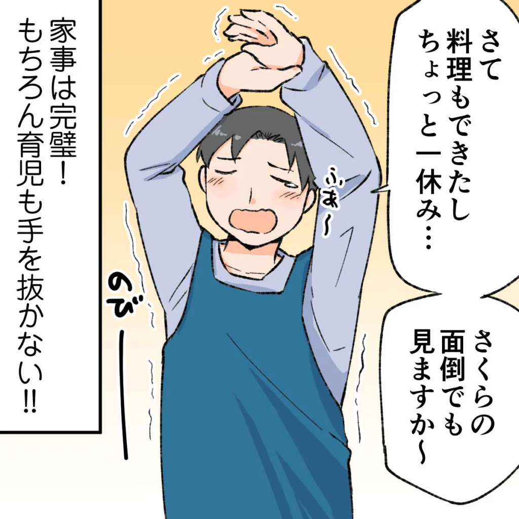 ゆきのがいなくても家事と育児を完璧にこなせるなんて、我ながら本当にできた夫です。夕飯のビーフシチューも無事に完成したことだし、さくらの面倒を見つつ、少し休憩することにします。