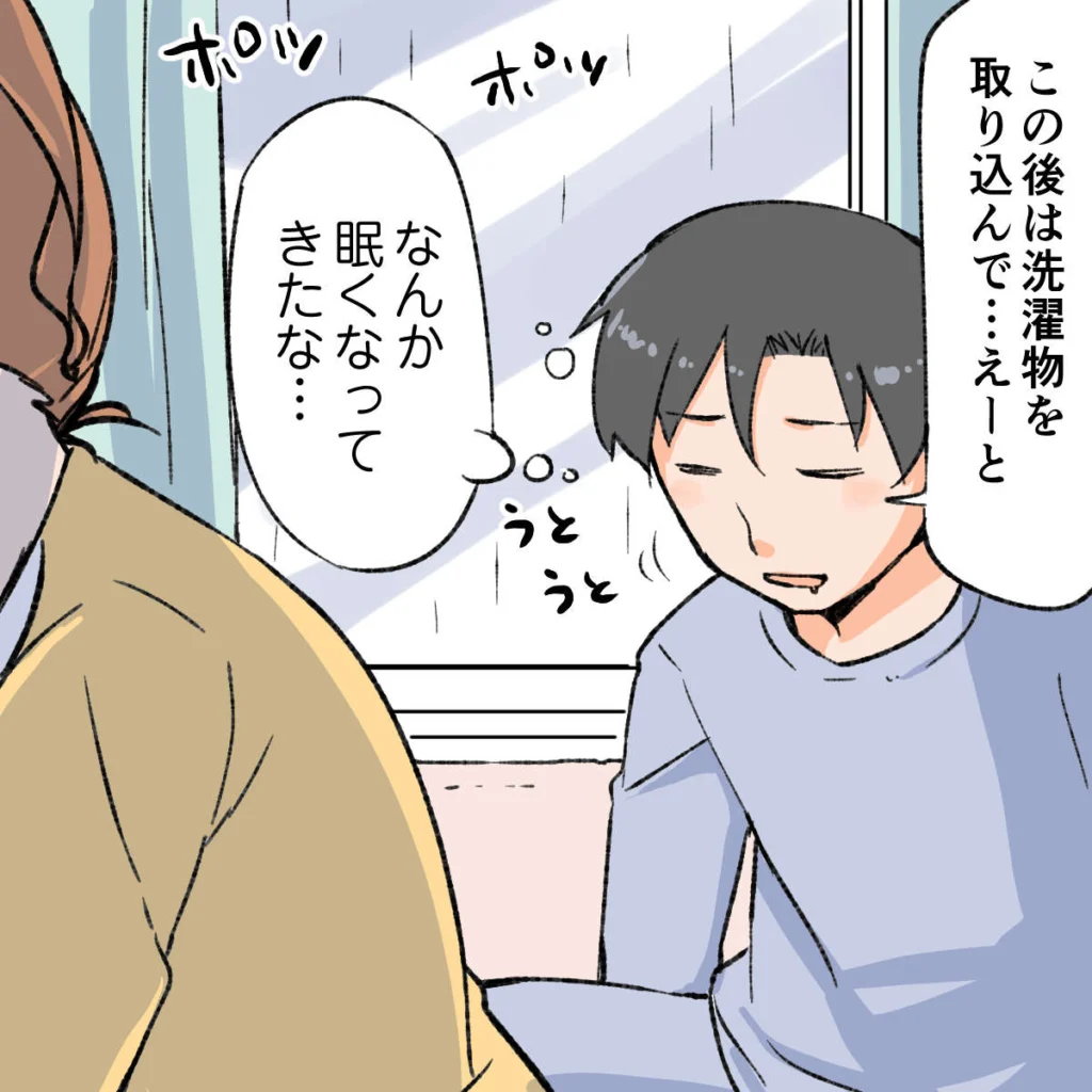「この後は洗濯物を取り込んで・・・えーと」そんなことを考えていると、なんだか眠たくなってきました。慣れない家事をしたせいか、思った以上に疲れが溜まったのかもしれません。俺は眠気に逆らえず、外で雨が降り始めていることにも気づかないまま、静かに目を閉じました。