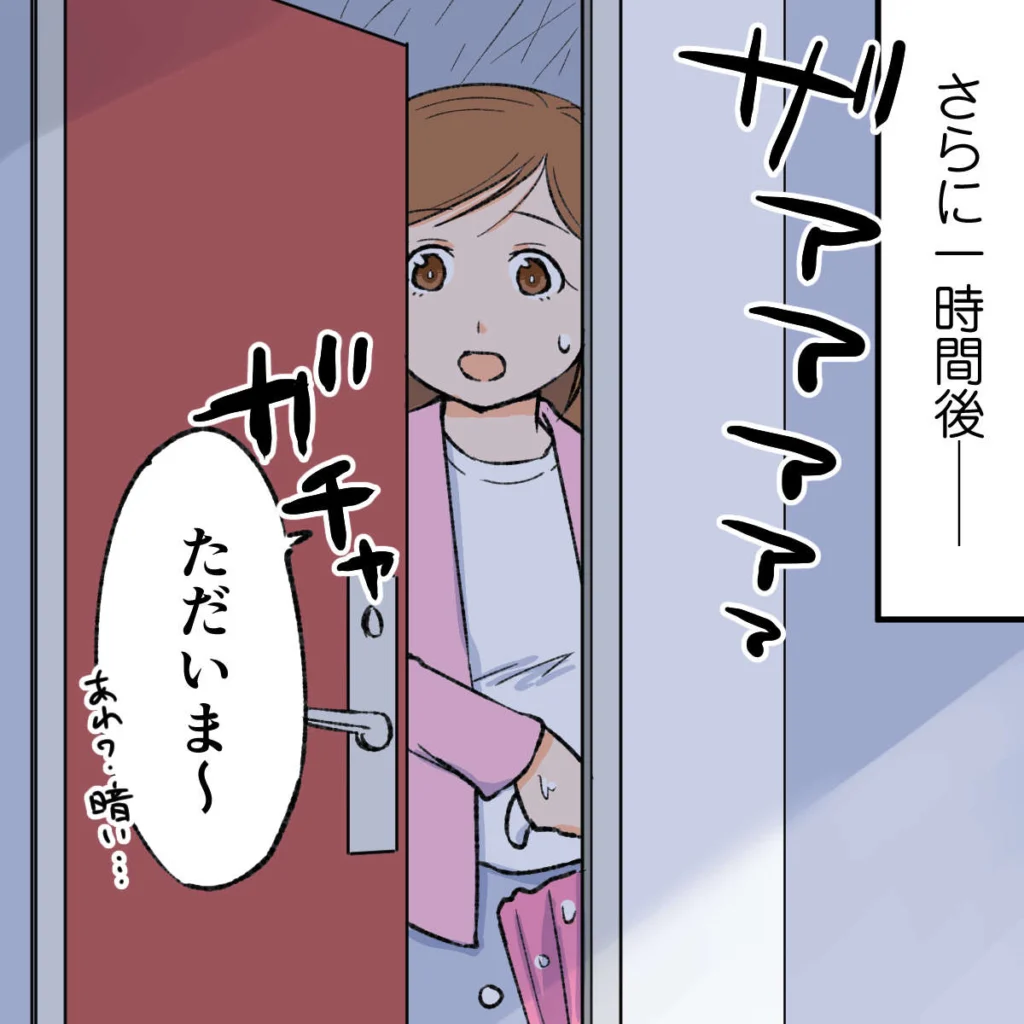 それから1時間後。大雨の中、ゆきのが帰ってきました。「ただいま~」と声をかけますが、返事はなく部屋の中は真っ暗。嫌な予感を抱えながら、ゆきのは玄関へ足を踏み入れます。