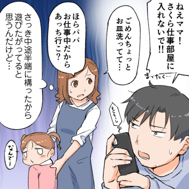 後から、「ねえママ!さくら、仕事部屋に入れないで!!まったく・・」とママに怒るオレ。「ごめん、ちょっとお皿洗ってて・・」ママはそう謝った後で、「ほらパパお仕事中だからあっち行こう」そう言いながら、「さっき中途半端にかまったから、遊びたがってると思うんだけど・・」と心の中で呟きました。