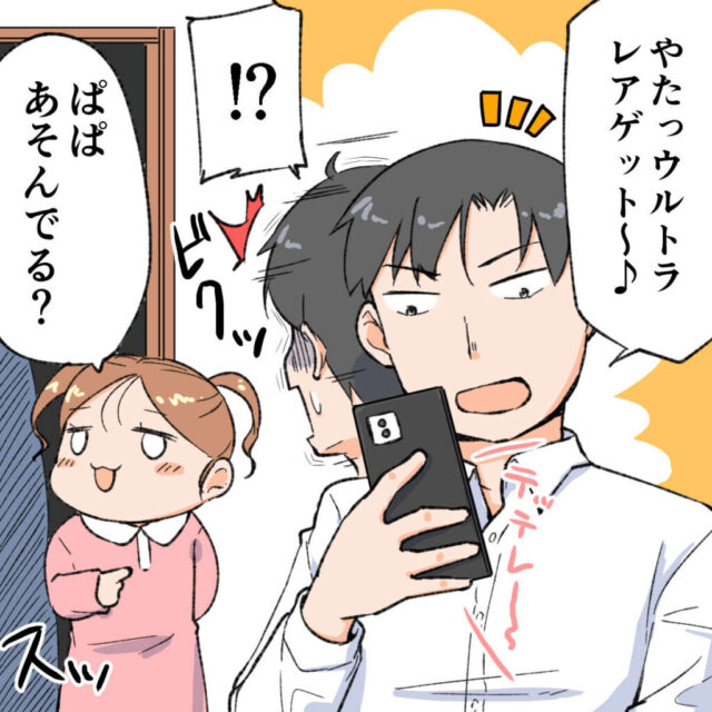 そしてさくらちゃんが仕事部屋のドアを開けると・・「やたっ!ウルトラレアゲット~!」とスマホを片手にゲームするご主人。「ぱぱあそんでる?」さくらちゃんの声に気づいてビクッとするご主人。そしてさくらちゃんの背後には人影が。