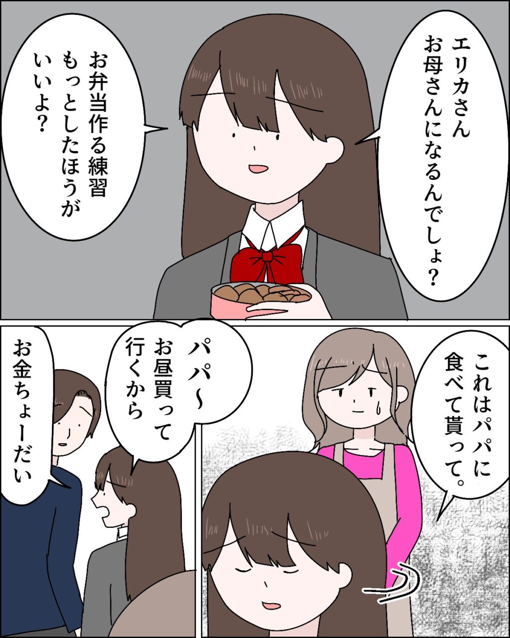 「エリカさんお母さんになるんでしょ?お弁当作る練習もっとしたほうがいいよ?」子どもが食べるものなんだから栄養バランスくらい考えないと・・・ため息をついて厳しい言葉を投げるジュリちゃん。「これはパパに食べて貰って」と言い、お弁当をエリカさんに返しました。