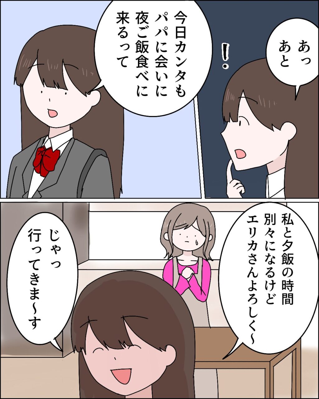 「あっあと、今日カンタもパパに会いに夜ご飯食べに来るって」と思い出したように言うジュリちゃん。エリカさんの顔を見ることなく、「私と夕飯の時間別々になるけどエリカさんよろしく~」と言い、マンションを後にしました。