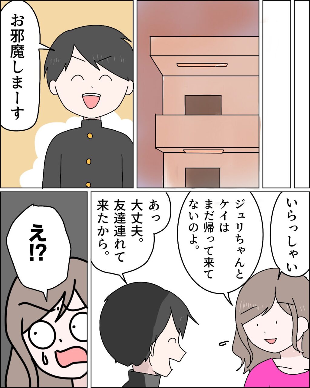 夕方頃、ジュリちゃんが言った通りカンタくんがマンションにやってきました。「いらっしゃい、ジュリちゃんとケイはまだ帰って来てないのよ」と言うと、「あっ大丈夫、友達連れて来たから」と笑顔で言いました。エリカさんは思わず「え!?」と聞き返します。