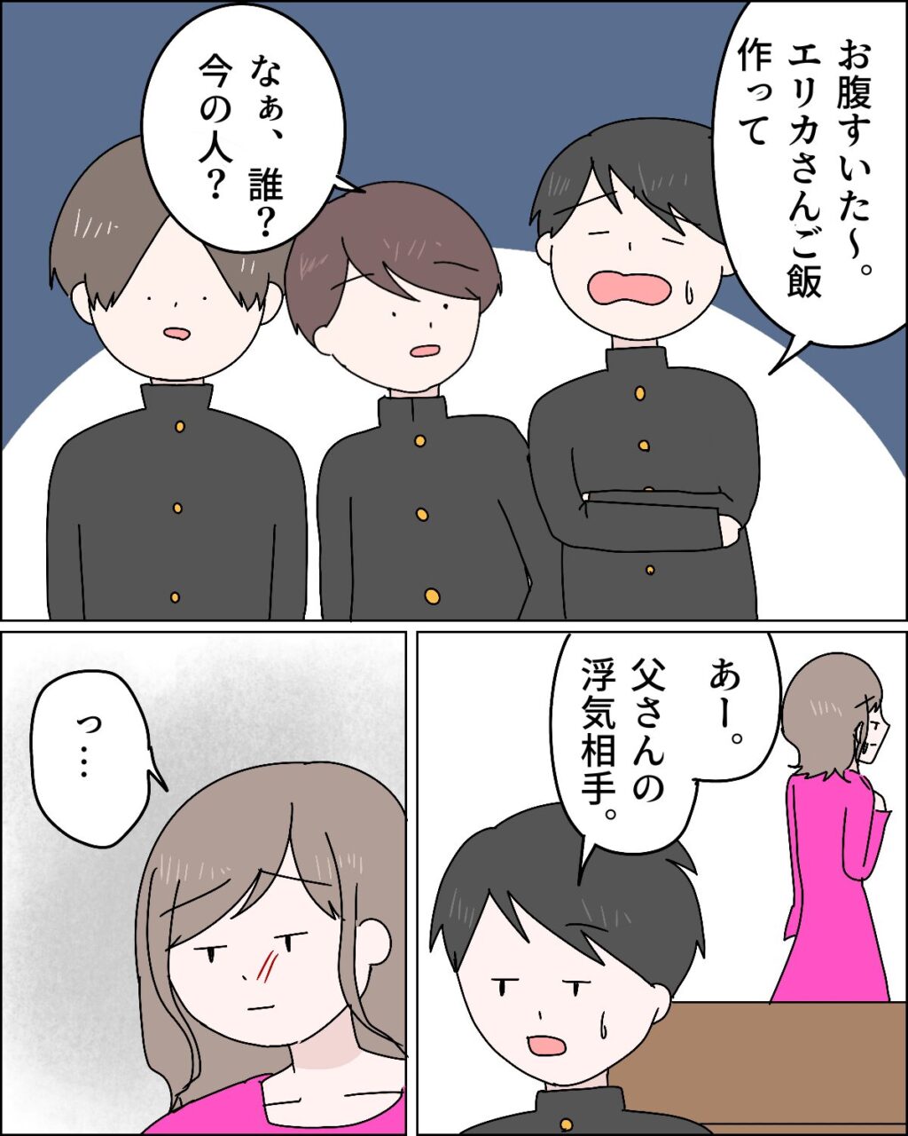 「お腹すいた~エリカさんご飯作って」カンタくんに連れられて、友達がぞろぞろと入ってきました。するとそのうちの1人が、「なぁ誰?今の人」と聞きます。カンタくんは気まずそうな顔をして「あー・・・父さんの浮気相手」と言いました。エリカさんは、言葉を飲み込んで顔をしかめました。