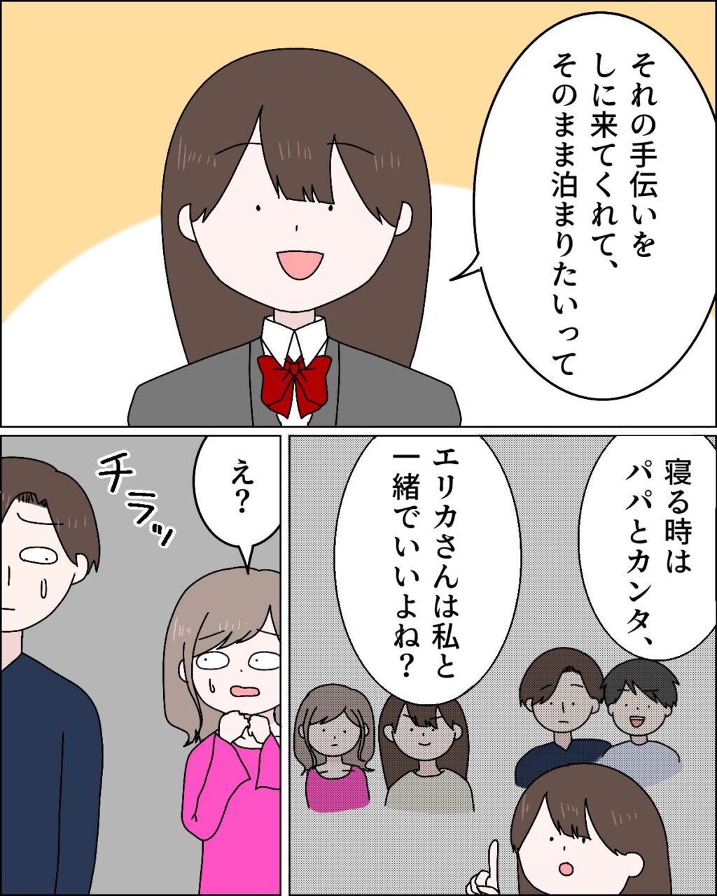「それの手伝いをしに来てくれて、そのまま泊まりたいって。寝るときはパパとカンタ、エリカさんは私と一緒でいいよね?」サクサク予定を決めていくジュリに、「え?」と驚きながら夫をチラ見するエリカさん。