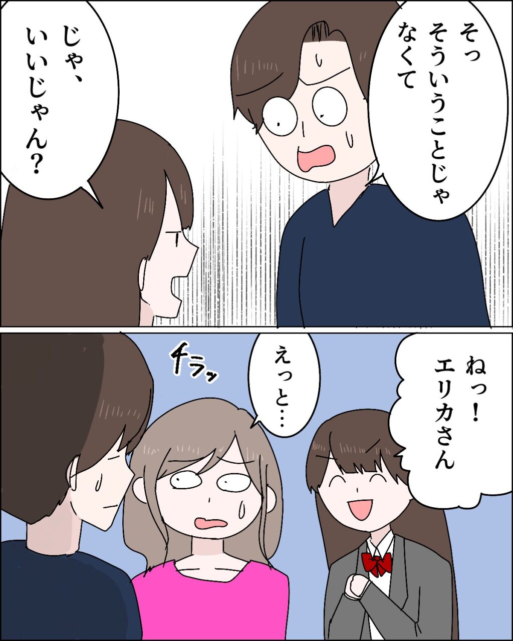 「そっ、そういうことじゃなくて」と動揺すると、「じゃ、いいじゃん?」と即答。「ねっ!エリカさん」と笑顔を向けられたエリカさんは、「えっと・・」と言葉を濁しながらもまた夫をチラ見。