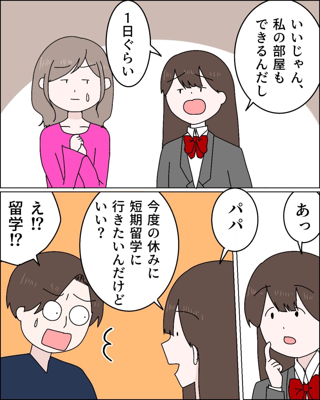 「いいじゃん、私の部屋もできるんだし。1日くらい」と言った後、「あっ、パパ、今度の休みに短期留学に行きたいんだけどいい?」とサラリと言うジュリに、「え!?留学!?」と取り乱していました。