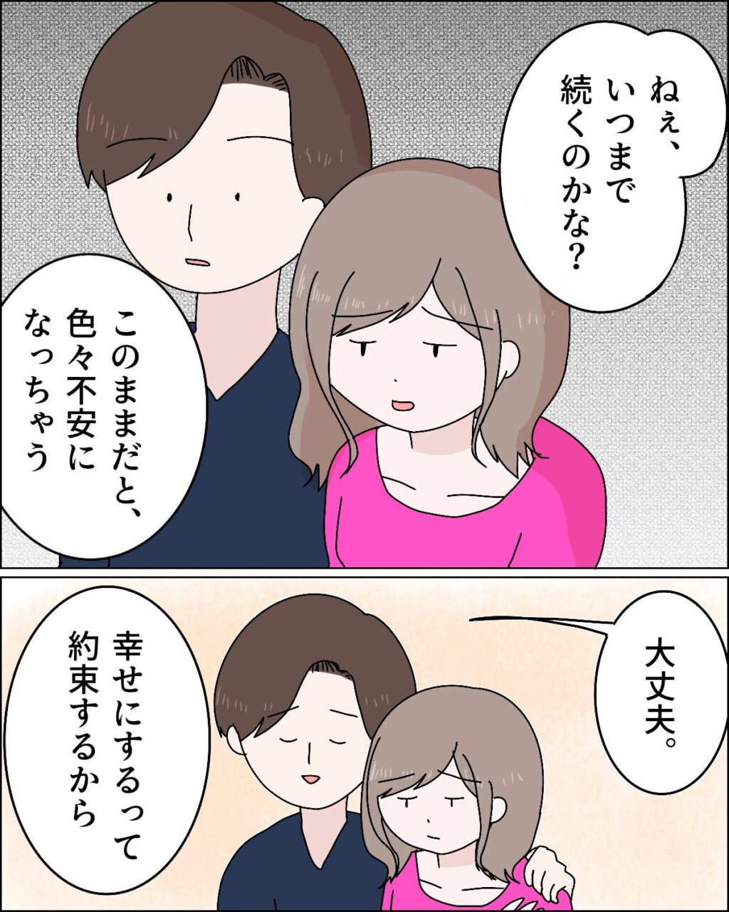 「ねぇ、いつまで続くのかな?このままだと色々不安になっちゃう」新居を侵食され、まるで召使いのように扱われる日々に耐えきれなくなったエリカさんは、ケイさんに本音を打ち明けました。するとケイさんは彼女の肩をそっと抱き寄せ、「大丈夫、幸せにするって約束するから」と言いました。